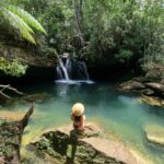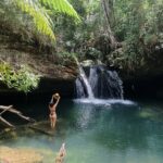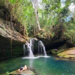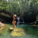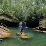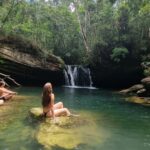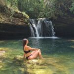 A cachoeira está imersa em uma paisagem exuberante, com águas cristalinas e um escorregador natural, proporcionando uma sensação de paz e harmonia com o ambiente natural.